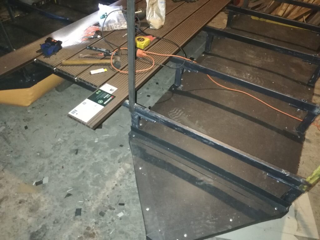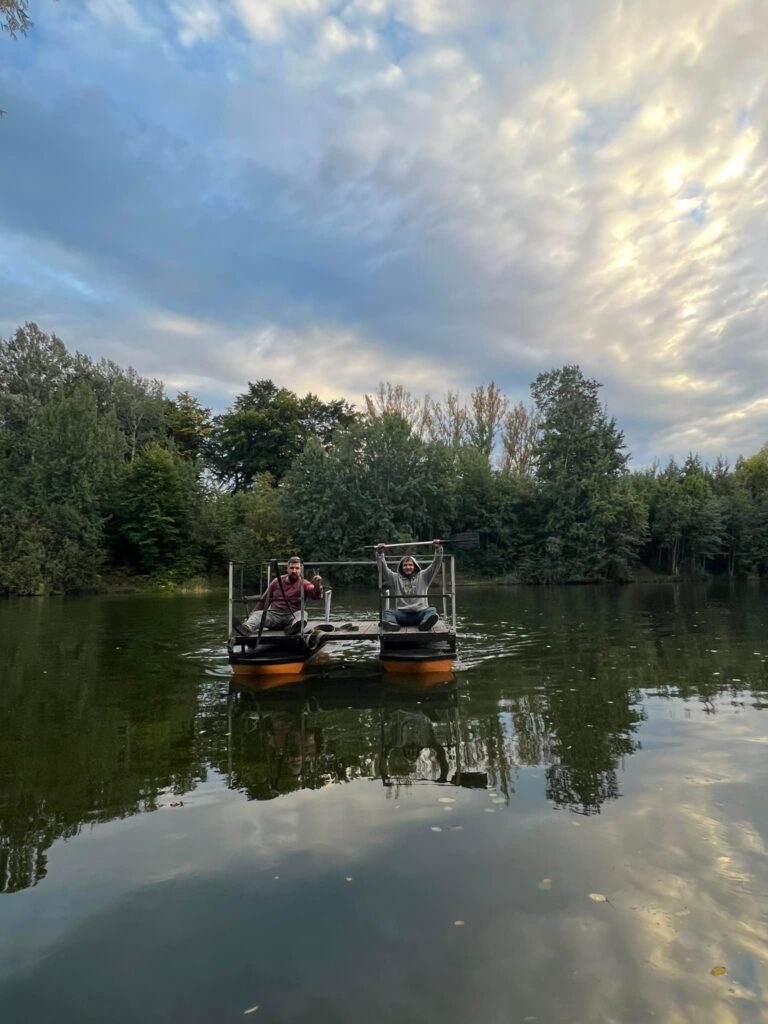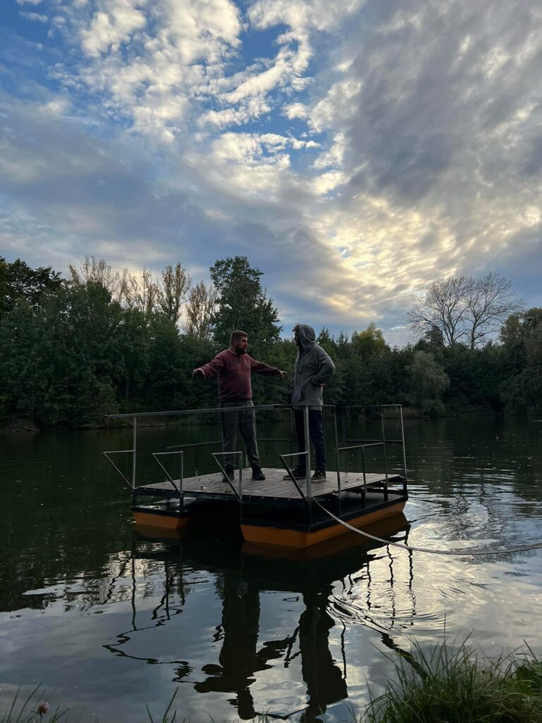 Kolejnym etapem było przygotowanie stalowej konstrukcji pokładu i solidne połączenie jej z pływakami. Dzięki temu platforma zyskała stabilność i odpowiednią nośność. Konstrukcja została pomyślana tak, aby była bezpieczna, trwała i łatwa w użytkowaniu. To właśnie na tym etapie nasz projekt zaczął nabierać kształtu prawdziwej platformy pływającej.